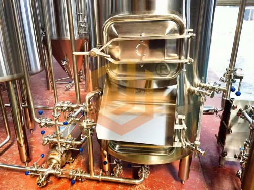 精釀啤酒設(shè)備使用的過(guò)濾槽與旋沉罐:采用上下兩層的設(shè)計(jì)方式,整體占地面積小,過(guò)濾槽采用銑制篩板,頂部采用異型人孔設(shè)計(jì),側(cè)面配有出糟口,方形人孔門設(shè)計(jì)更有利于啤酒麥糟的清理工作,同時(shí)還配有出糟板。內(nèi)部配有耕刀裝置,用于疏松麥糟層以及出糟使用。